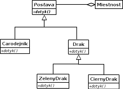Uvedené riešenie je len jedno z možných. Napríklad postava namiesto abstraktnou triedou môže byť modelovaná rozhraním. Množina postáv v miestosti môže byť reprezentovaná v inom kontejneri než ArrayList alebo aj ako reťazec (array). Ďalej, odkaz na miestnosť môže byť uchovávaný v postavách, a nie naopak. Tento odkaz by potom mal byť v triede Postava (Postava v takomto prípade nemôže byť rozhranie) — ostatné triedy ho potom zdedia.